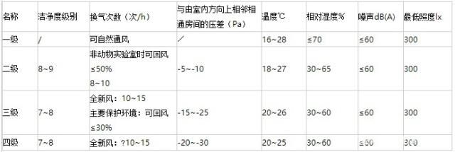 1)、 表中“/”表示不做要求,本表中的噪聲不包括生物安全柜、動(dòng)物隔離器的噪聲,如包括上述設(shè)備的噪聲,則最大不應(yīng)超過(guò)68dB(A)